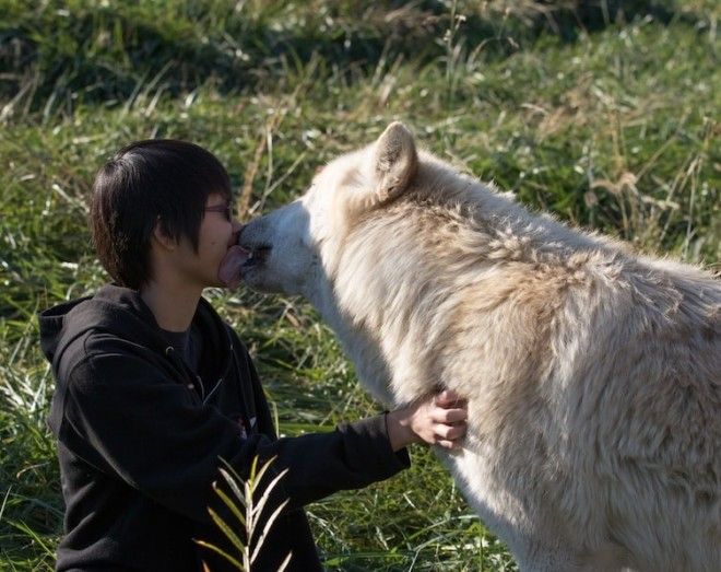 Теплая встреча с волком. Даже если волк "ручной", смотреть страшно!